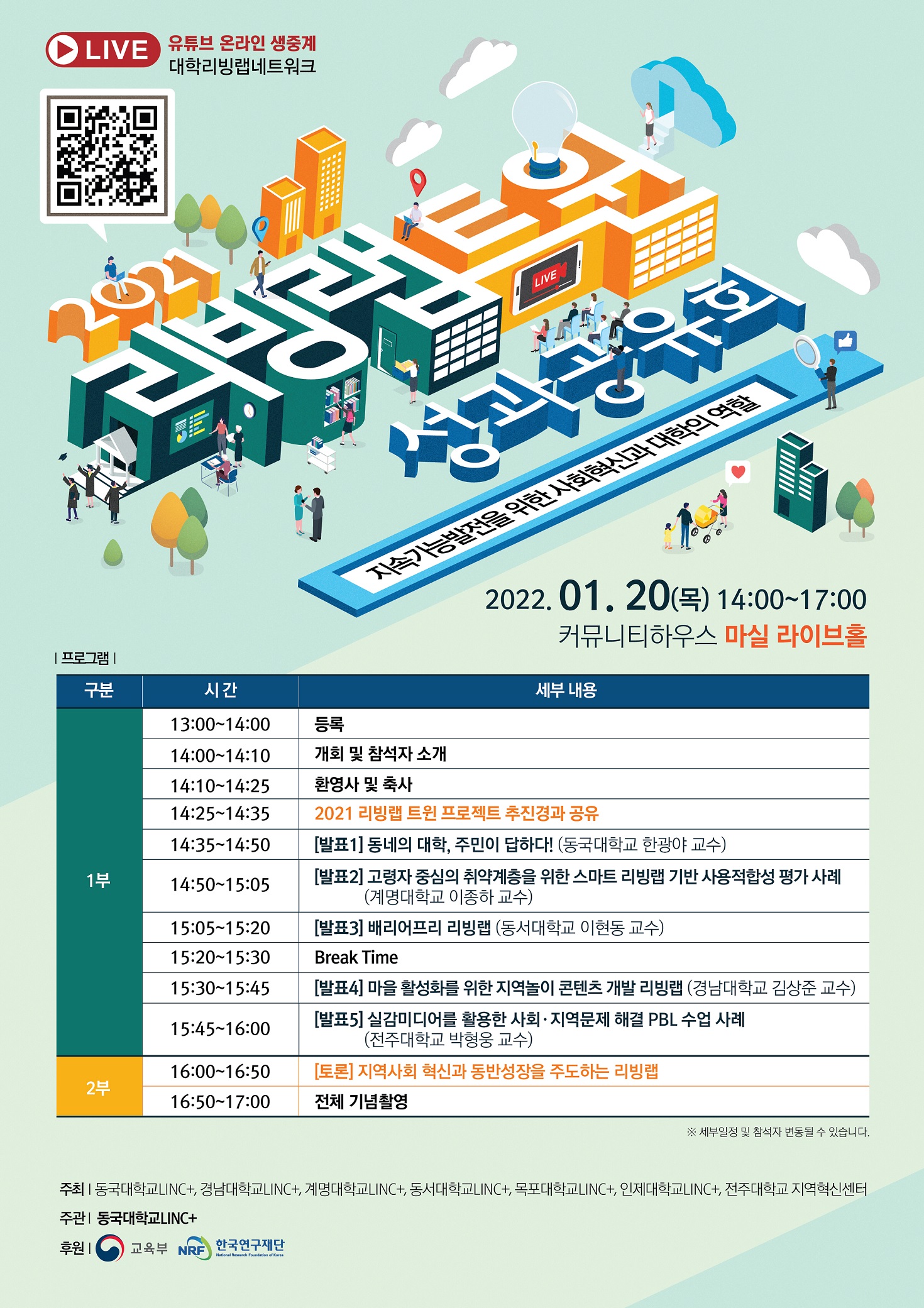 ▶ 동국대학교 LINC+사업단에서는 함께 성장하는 공유·협업 생태계 조성을 위해 대학리빙랩네트워크 협약대학을 중심으로 공동으로 추진한 2021 리빙랩 트윈 프로젝트 성과보고회를 아래와 같이 개최하오니 많은 관심과 적극적인 참여 부탁드립니다.