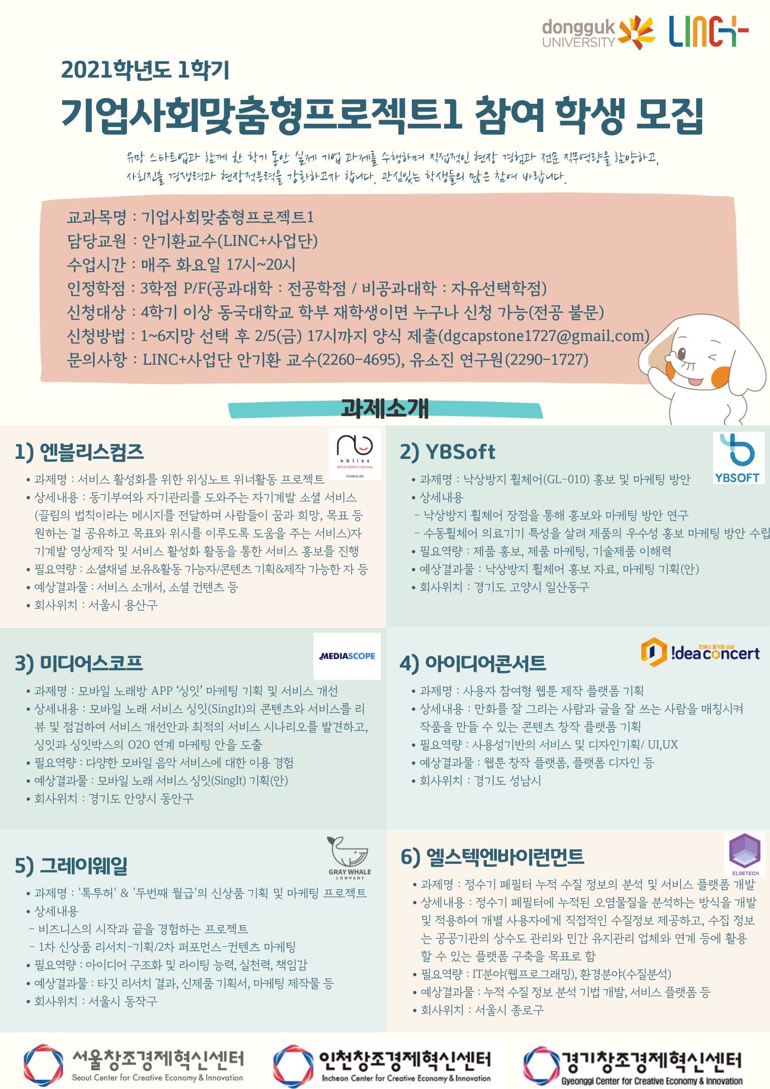 2021학년도 1학기 [기업사회맞춤형프로젝트1]는 동국대학교 LINC+사업단이 수도권 3개 창조경제혁신센터 보육기업과 공동으로 기획하여 개설하는 산학연계 캡스톤디자인 정규 교과목입니다. 유망 스타트업과 함께 한 학기 동안 실제 기업 과제를 수행하며 직접적인 현장 경험과 전문 직무 역량을 함양하고, 사회 진출 경쟁력과 현장 적응력을 강화할 수 있는 본 교육과정에 역량 있는 학생들의 많은 참여를 기대합니다.