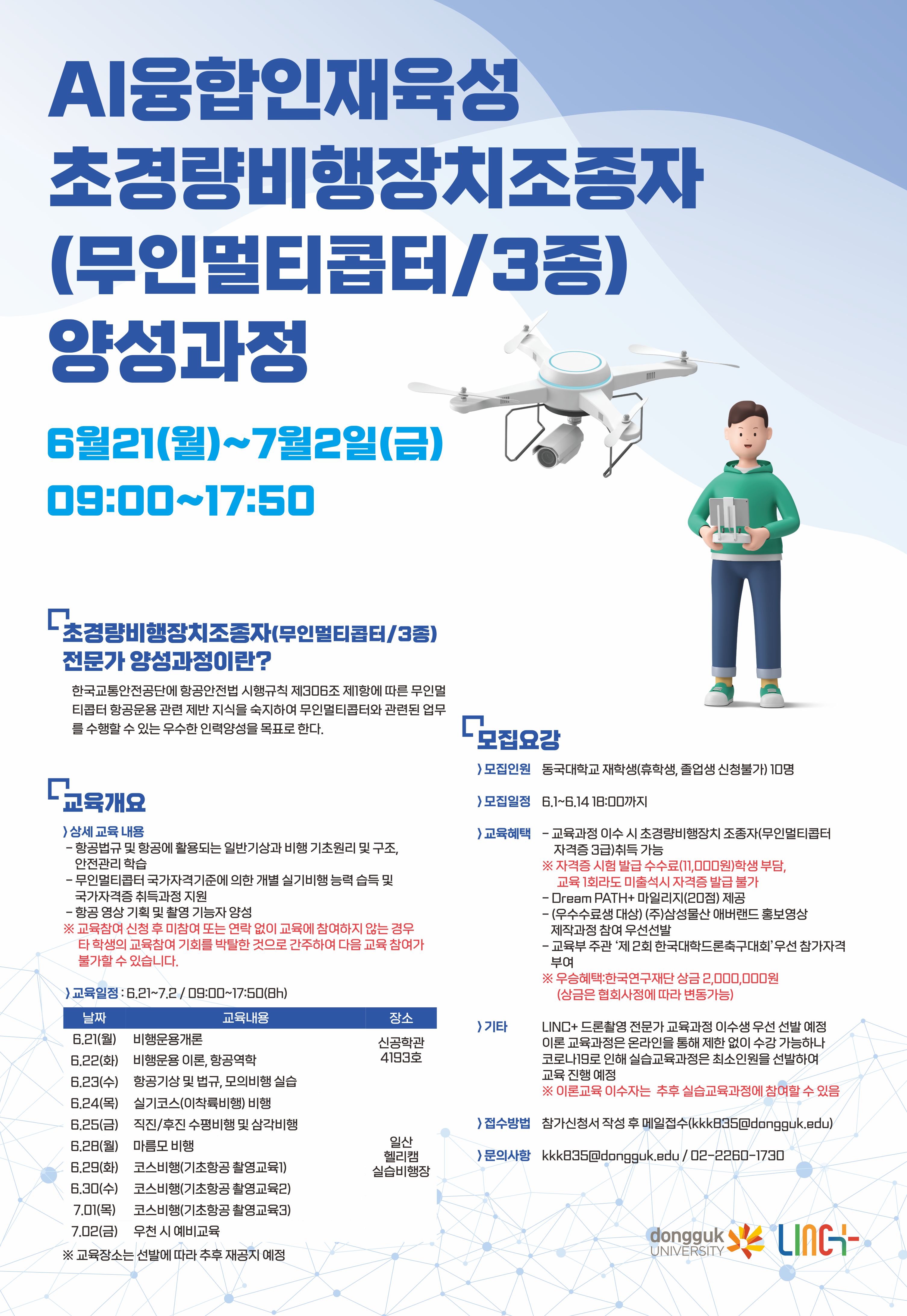 동국대학교 LINC+사업단에서는 4차산업혁명 사업을 선도할 전문인력 육성을 위해 초경량비행장치 조종자(무인멀티콥터 자격증 3급) 전문가 양성과정을 아래와 같이 운영하고자 합니다. 관심 있으신 재학생 여러분들의 많은 신청 부탁드립니다.