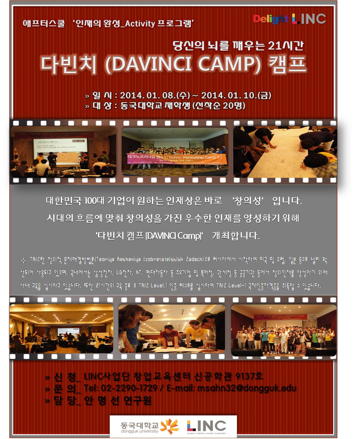 8. 담당자 : 동국대학교 LINC사업단 창업교육센터 안명선 연구원(Tel. 02-2290-1729 / e-mail. msahn32@dongguk.edu)