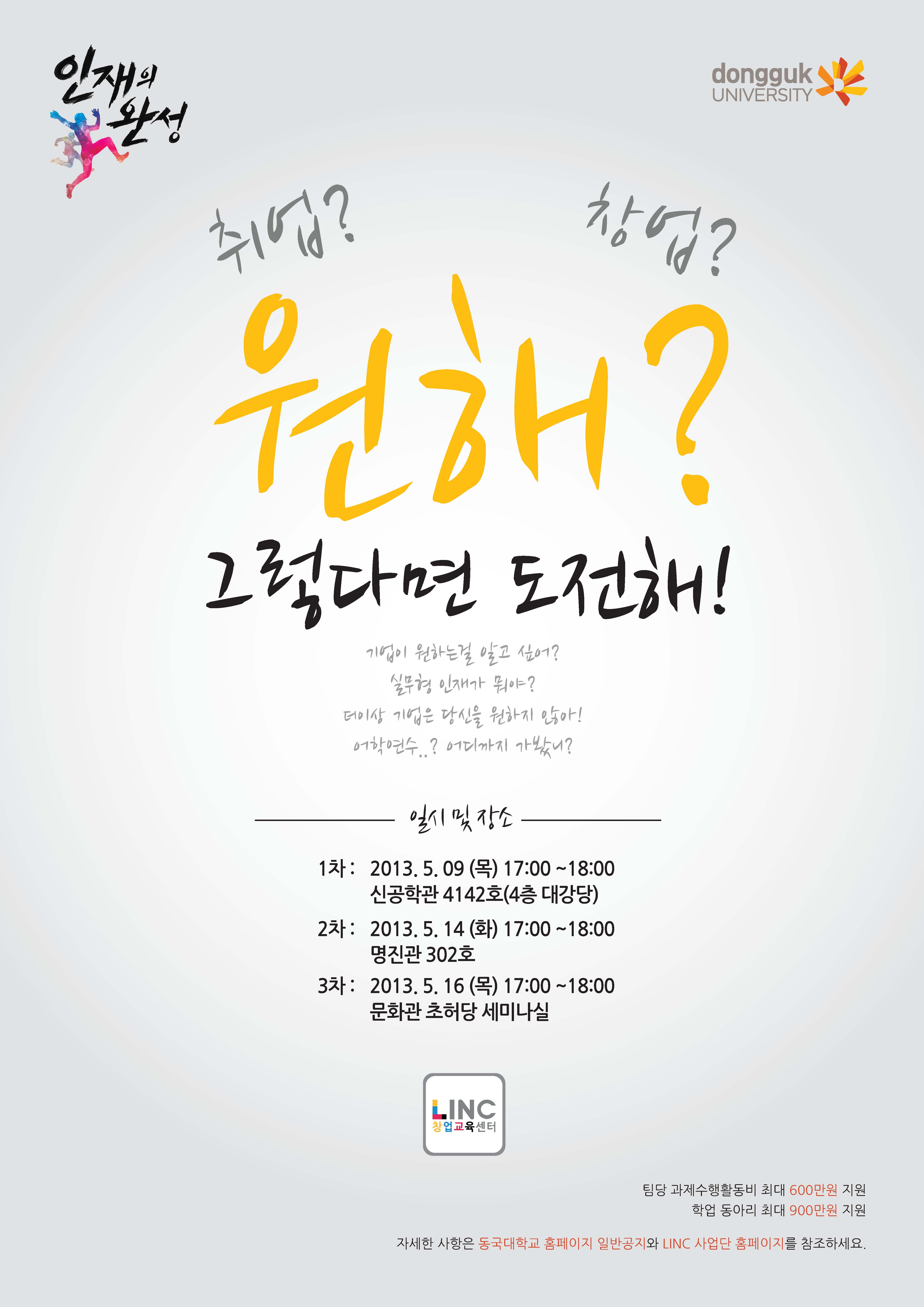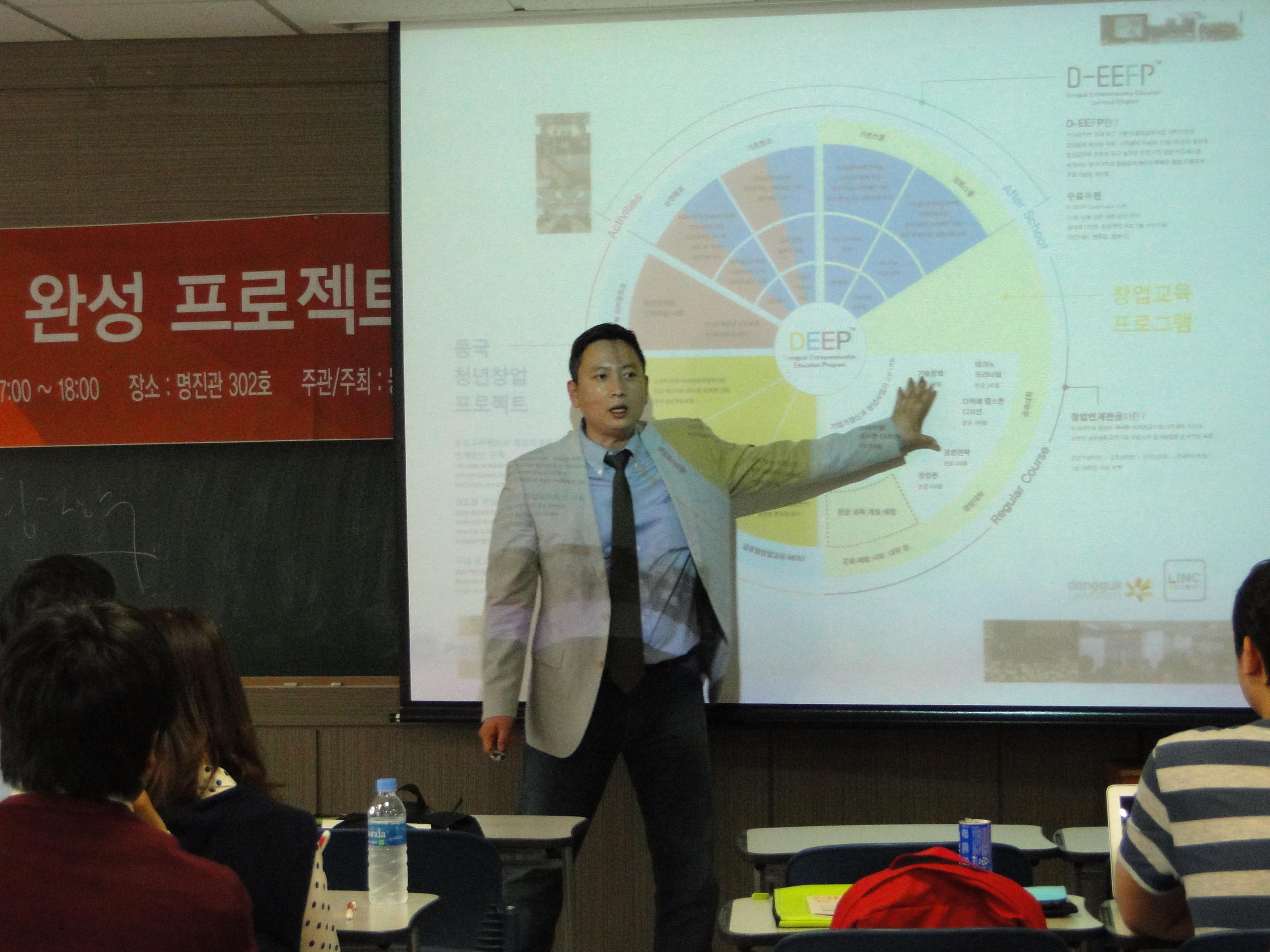 창업교육센터에서 동국대학교 재학생들을 대상으로 기업가마인드를 보유한 우수인재 양성 및 창업교육센터의 교육 프로그램 소개 및 창업동아리 지원사항과 관련한 안내를 위해 ‘인재의 완성 프로젝트 사업 설명회’를 개최.