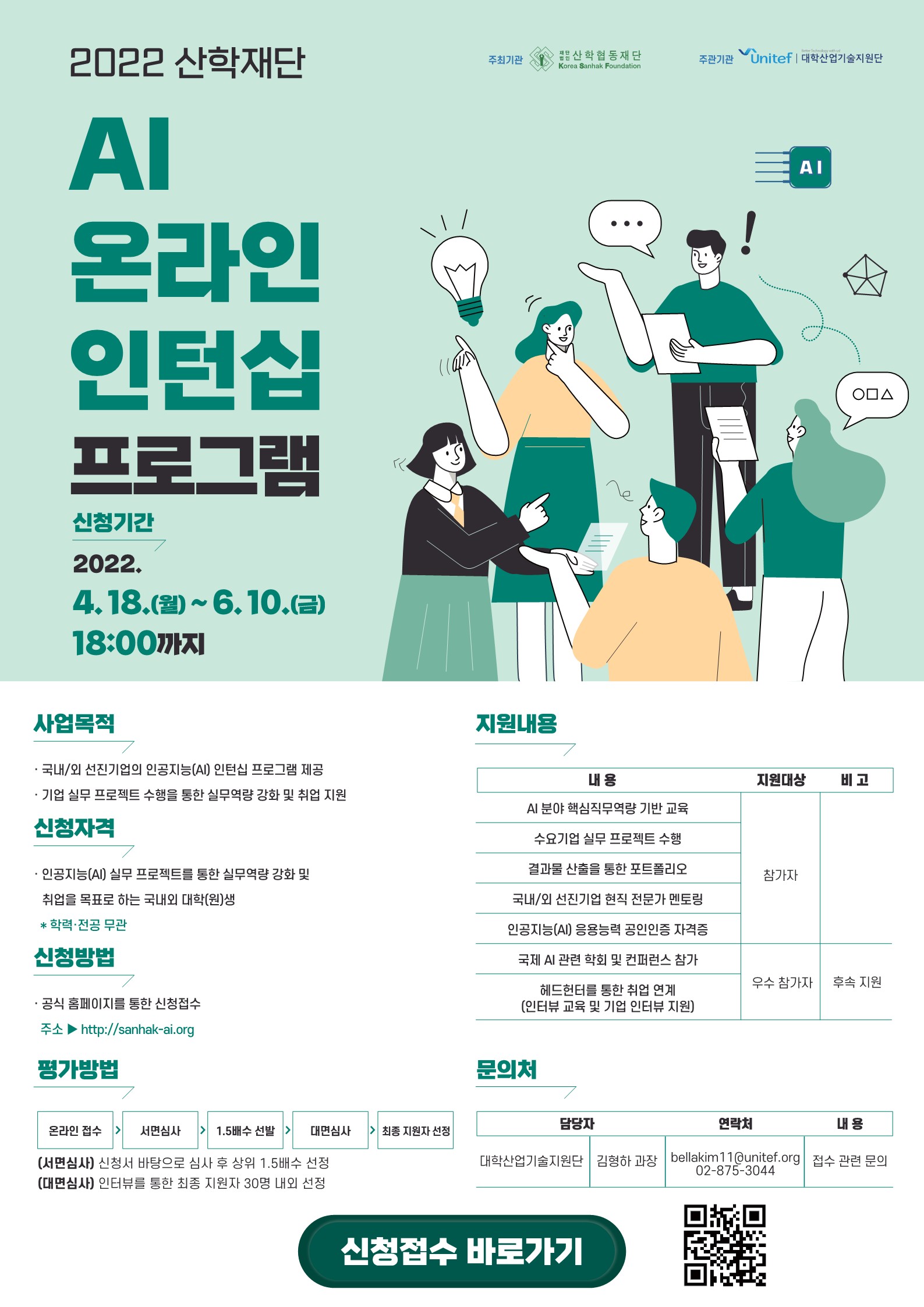 산학협동재단에서 인공지능(AI) 분야 인재 양성을 위해 “2022 산학재단 AI 온라인 인턴십 프로그램”을 아래와 같이 모집하오니 많은 학생분들 관심 및 신청주세요