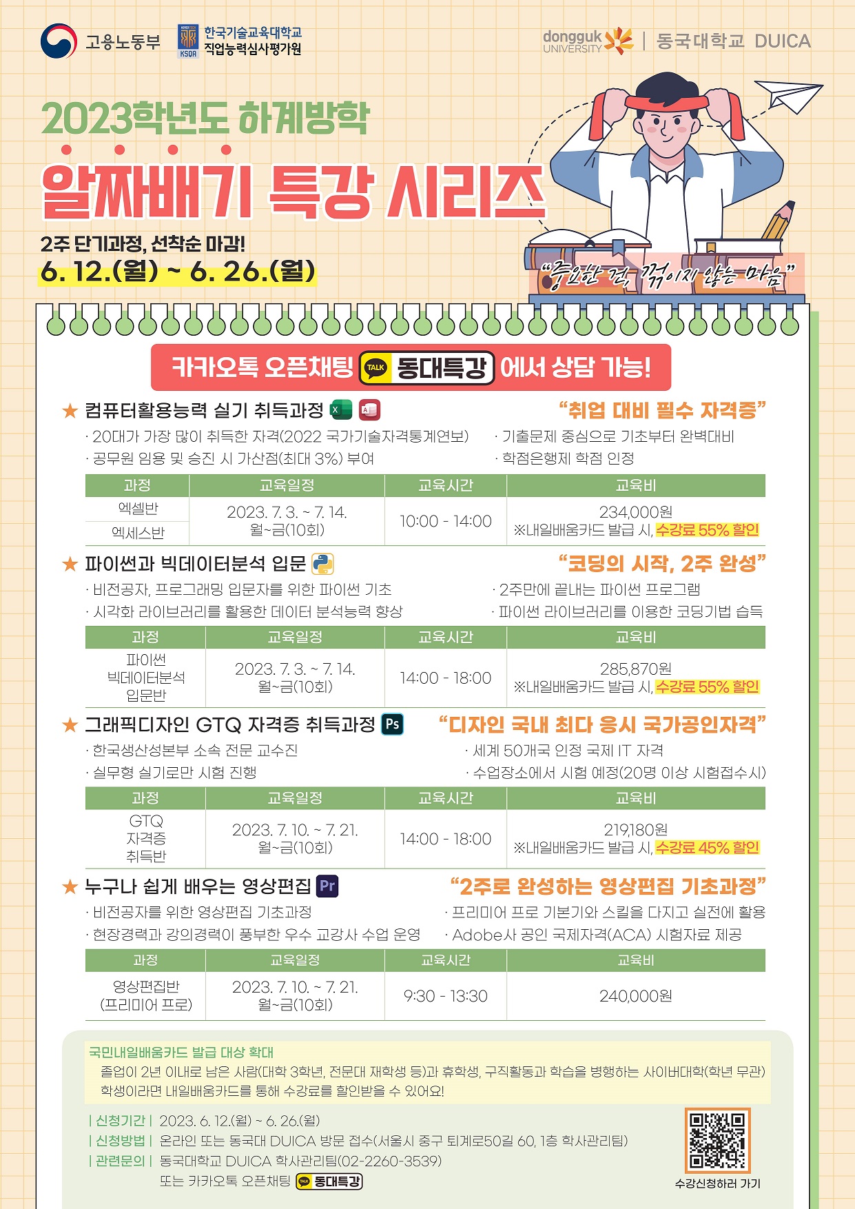 동국대학교 DUICA에서는 취업, 이직, 역량개발 및 향상을 희망하는 다양한 직업훈련층(대학생, 재직자, 개인사업자, 프리랜서 등)을 대상으로 하계방학 특강을 개설하여 운영하고자 합니다.