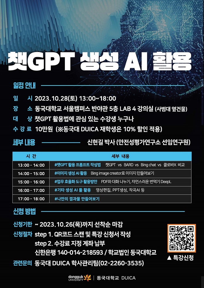 챗GPT 활용법에 관심 있는 누구나 신청 가능하며 더 자세한 사항은 듀이카 학사관리팀으로 문의바랍니다.