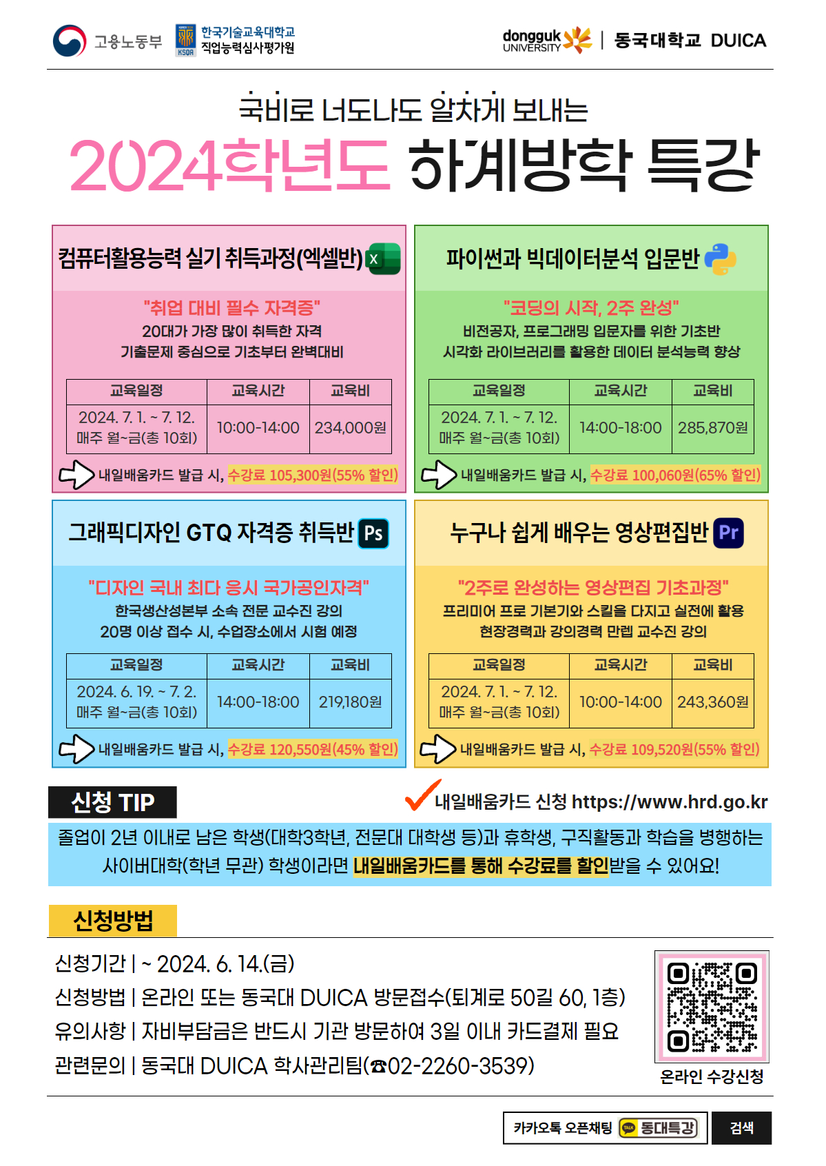 동국대학교 DUICA에서는 취업, 이직, 역량개발 및 향상을 희망하는 다양한 직업훈련층(대학생, 재직자, 개인사업자, 프리랜서 등)을 대상으로 하계방학 특강을 개설하여 운영하고자 합니다.