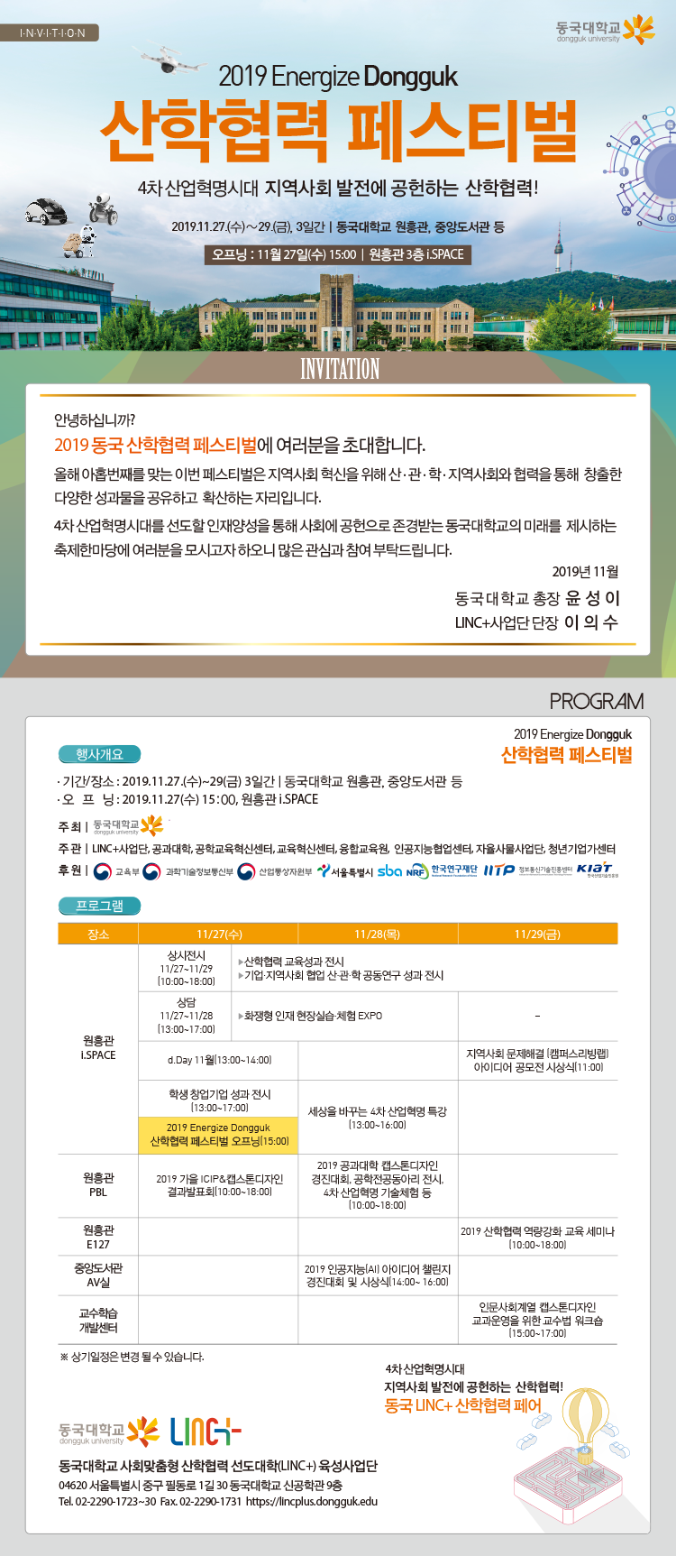 우리 대학생들에게 많은 변화와 혁신을 요구하는 오늘날, 올해 아홉번째를 맞는 「2019 Energize Dongguk 산학협력 페스티벌」이 4차 산업혁명시대를 선도할 인재를 양성하고 지역사회를 공헌하는 다양한 프로그램 우수성과를 공유하고 확산하는 자리가 될 수 있기를 소망하며, 귀하를 초대합니다.