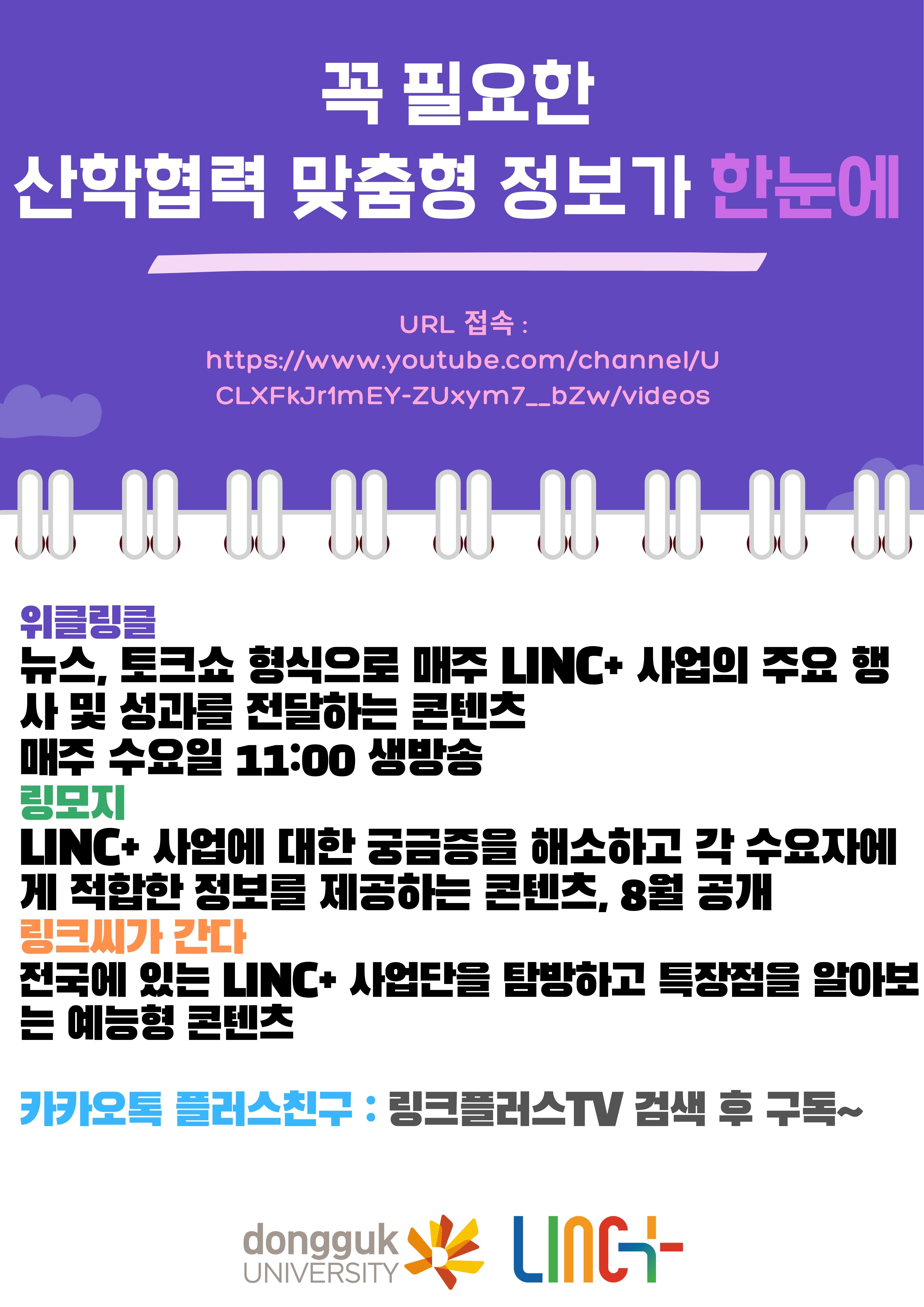 - 링크씨가 간다 : 학교별 LINC+ 사업 참여 대학의 프로그램에 직접 참여, 프로그램 참여 특장점 소개 <방영 스케쥴> 매주 금요일, 9.3일 첫 방송 예정, 총 20편 제작