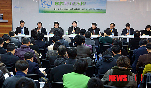 안철수 무소속 의원이 17일 오후 서울 강남구 역삼동 새롬빌딩에서 열린 '창조경제 연구회 4차 공개포럼'에 참석, 기업가정신 교육에 대해 발언하고 있다.