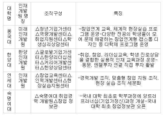 연세대도 인재개발원 산하에 창업교육센터, 인력개발센터, 현장실습지원센터 등을 뒀으며, 숙명여대도 취업경력개발원 옆에 창업정보관을 나란히 배치해 취업 및 창업 정보를 손쉽게 제공할 수 있도록 했다.