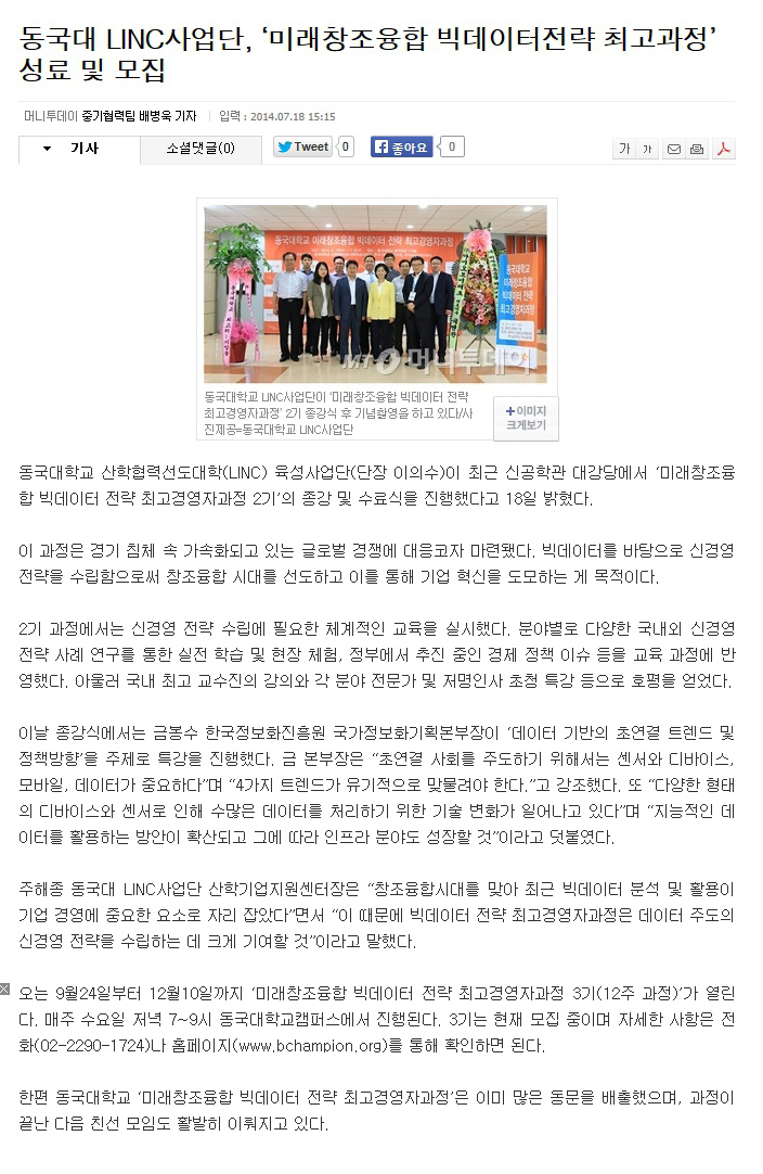 [머니투데이/14.07.18] 동국대 LINC사업단, \'미래창조융합 빅데이터전략 최고과정\' 성료 및 모집