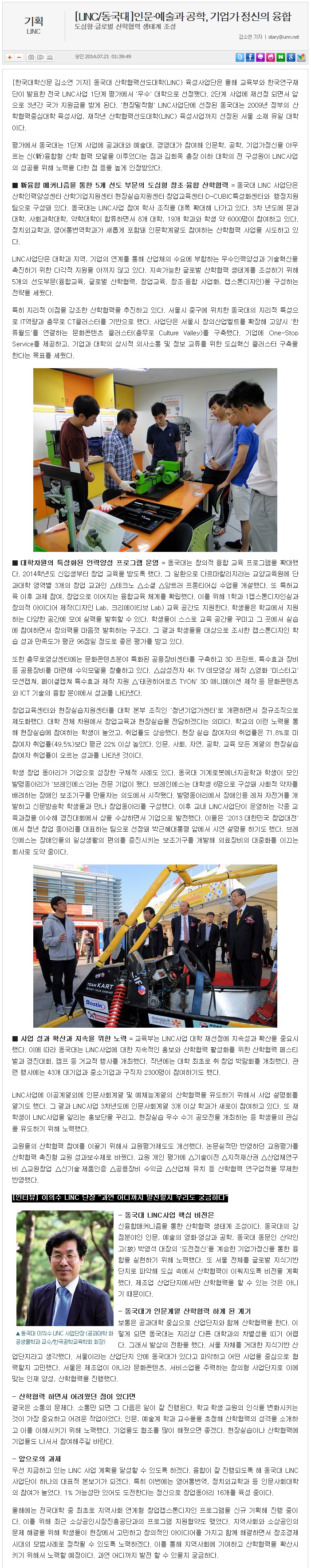 [한국대학신문/14.07.21] [LINC/동국대]인문·예술과 공학, 기업가 정신의 융합